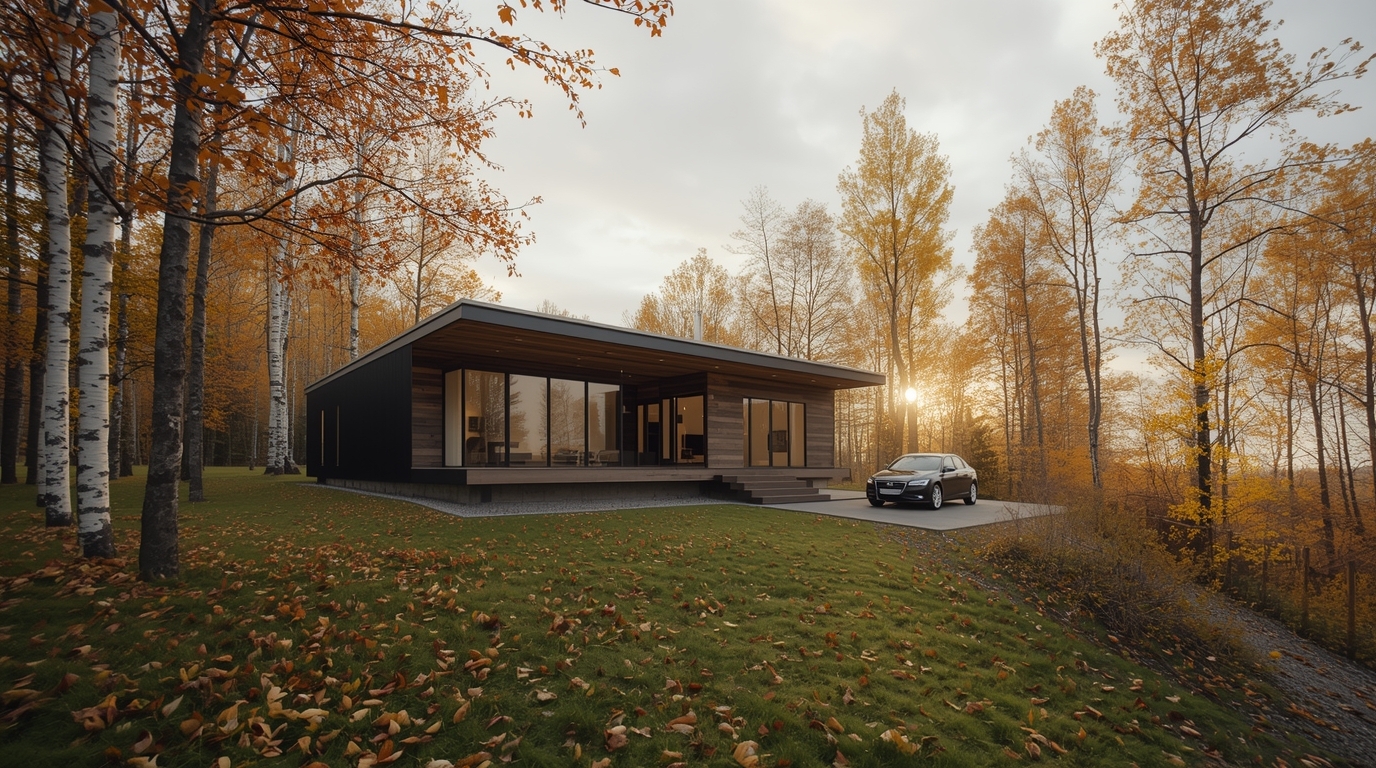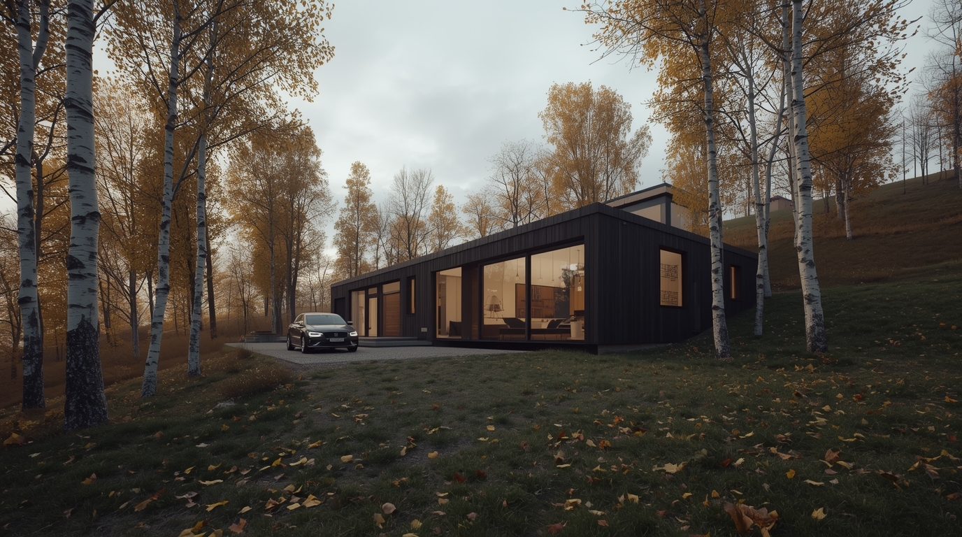 Подмосковные ландшафты не требуют визуального давления. Здесь лучше всего работают простые формы, ясная геометрия и архитектура, которая не спорит с природой. Модульные дома вписываются в этот контекст почти незаметно: аккуратные прямоугольные объёмы, чистые линии, панорамные окна и продуманная посадка дома на участке.