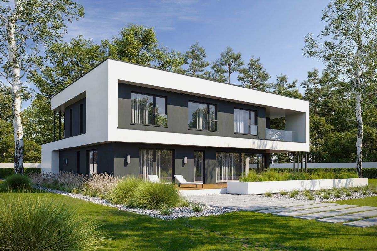 Все проекты EcoCub создаются в стилистике современного минимализма и хай-тека — плоские кровли, панорамные окна, строгая геометрия и экологичные цветовые решения.